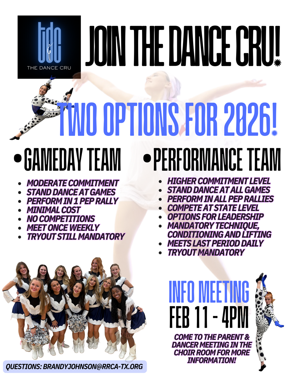 The Dance Cru (TDC) is made up of high school students in 9th -12th grades who love to dance. TDC performs year-round, focusing on numerous dance genres including jazz, contemporary, Broadway, pom, lyrical and hip hop. They attend National Dance Association’s Summer Intensive Camp to prepare for performances at pep rallies and varsity football games held in the fall. The dance team competes at the state level through TAPPS and has either won State or been State Runner Up all three years that the team has been in existence. TDC performs at select basketball games and will wrap up their season performing for the RRCA Christmas Stroll, The Austin Spurs and select members of the team will perform in our annual Spring Show in May. The team prides itself on a family atmosphere, a strong work-ethic, and a positive team emphasis.
